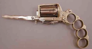 This custom-made, foldable nightmare was basically a Swiss Army knife built strictly for trench warfare. It mashed three deadly weapons into one compact piece of brass and steel. Folded up, it functioned as a heavy set of brass knuckles. Unfolded, a spring-loaded, dual-edged knife blade popped out for close-quarters combat. Finally, the brass knuckle grip served as the handle for a six-shot, pinfire revolver. It had absolutely no barrel, meaning it couldn’t hit the broad side of a barn past three feet. But if an Apache was mugging you in a pitch-black alleyway, it was a devastatingly effective piece of hardware.
